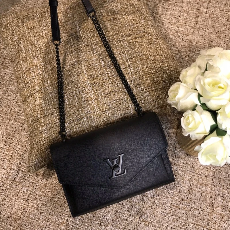 The Louis Vuitton AAA-Mylockme BB is a luxury handbag made of black soft grained calfskin leather, featuring a front and inside flat pockets, LV turn lock, and sliding chain with adjustable chain drop of up to 20.9 inches. Its tone-on-tone matte-finish hardware and microfiber lining add to its stylish appeal.