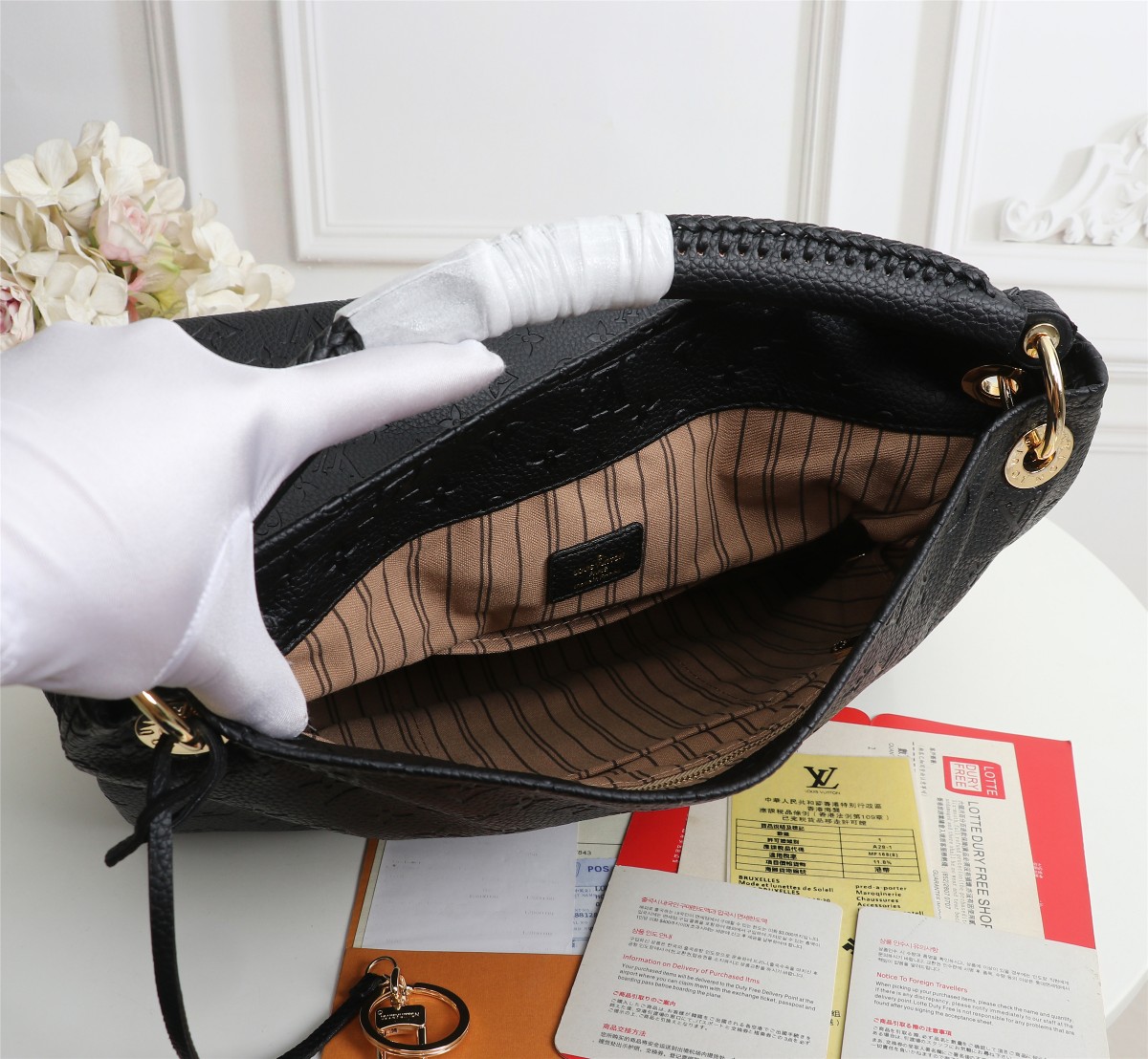 The Louis Vuitton ARTSY MM MONOGRAM Multi-Colors is a luxurious and stylish handbag made with black Monogram Empreinte embossed supple grained cowhide leather and supple grained cowhide leather. The bag has a single handle for carrying, gold-color hardware, and a key bell with a key ring and hook. It has a large inside zipped pocket and six inside flat pockets (three on each side) for ample storage space. The bag measures 41 x 32 x 22 cm (length x height x width) and features four protective metal bottom studs. The ARTSY MM MONOGRAM is a visually stunning and practical choice for anyone looking for a high-quality handbag.