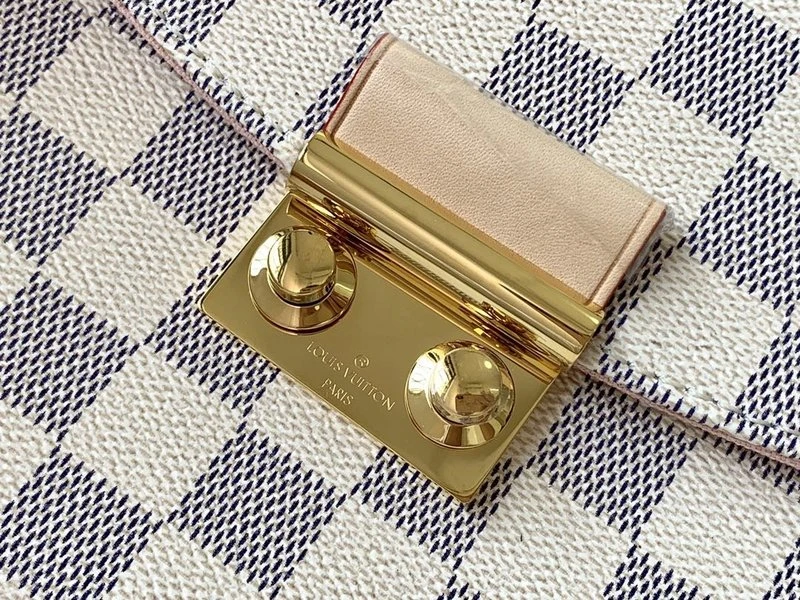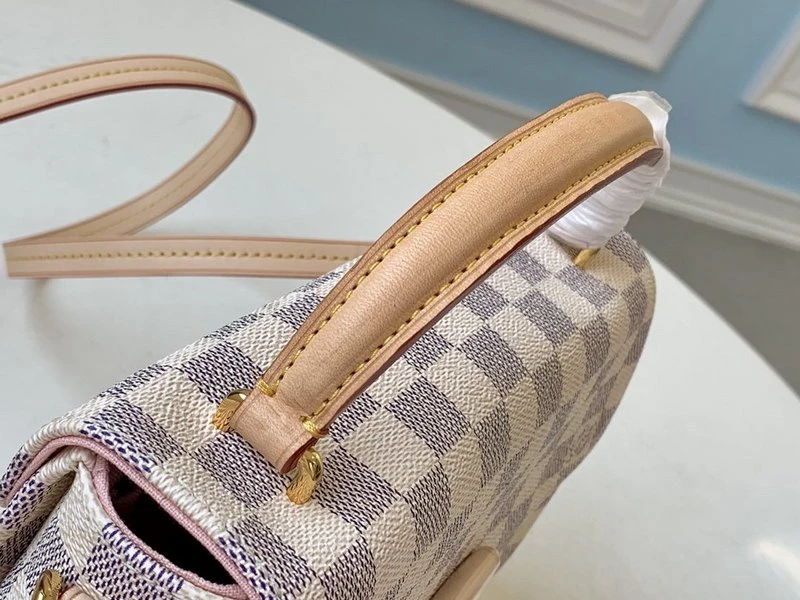 The Croisette features a timeless design highlighted by the iconic LV Damier print. Its effortlessly chic aesthetic is accentuated by refined details such as a natural cowhide leather trim and shiny golden color metallic pieces. The bag is equipped with an S-lock closure that adds a touch of class while ensuring the security of your essentials.