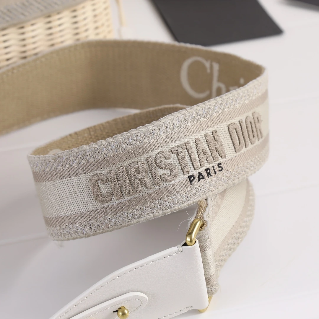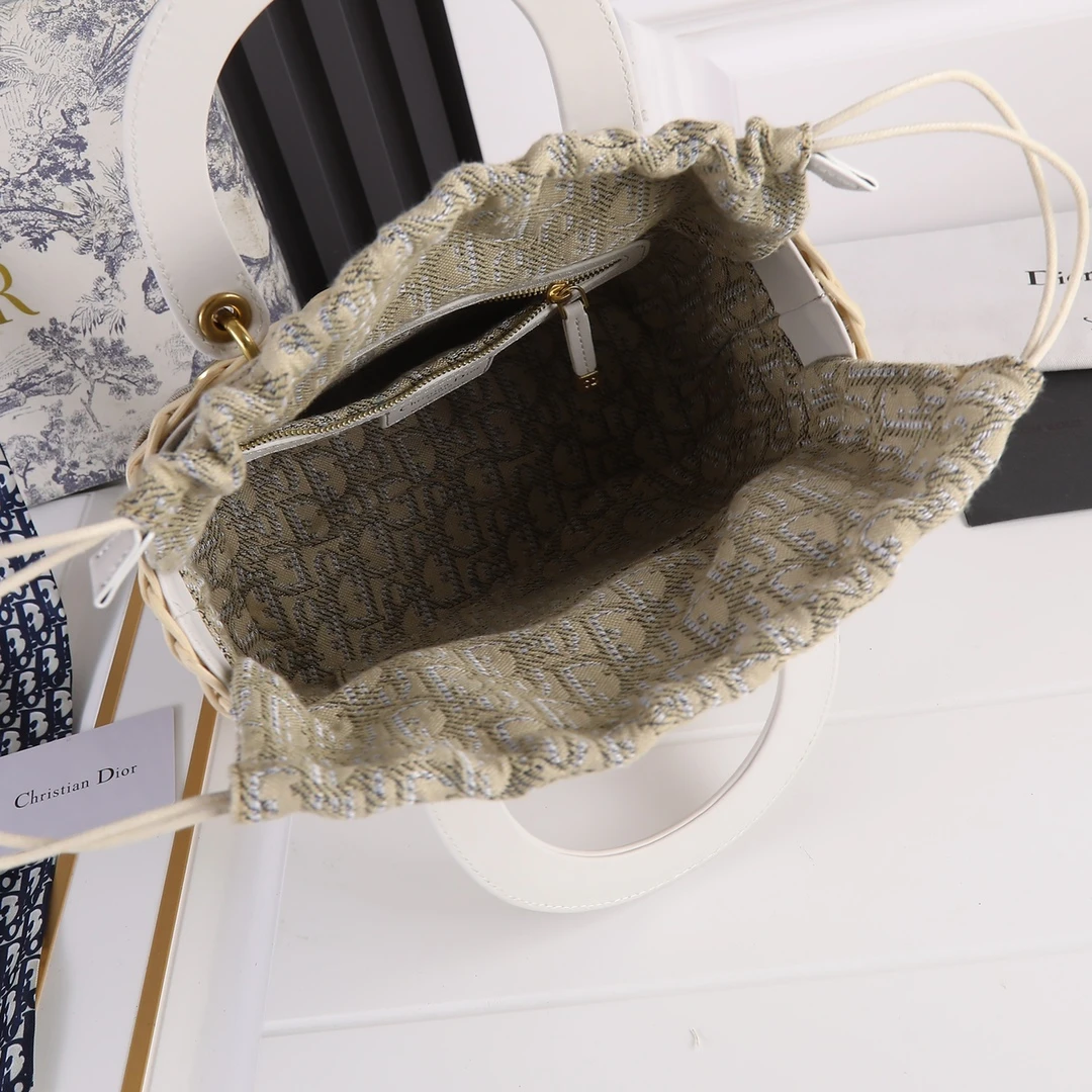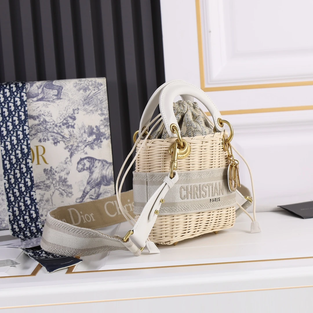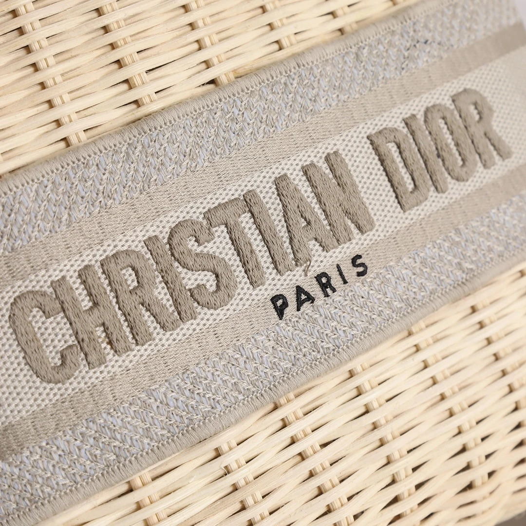 The Dior Lady D Bag-Grey is a stylish handbag made of natural wicker and blue Dior oblique jacquard. It comes in two sizes and features a wide, removable, reversible and adjustable embroidered shoulder strap, an interior zip pocket, and the signature ‘CHRISTIAN DIOR’ on the front. The package includes a dust bag for easy storage. It is a fashionable and versatile bag perfect for any occasion.