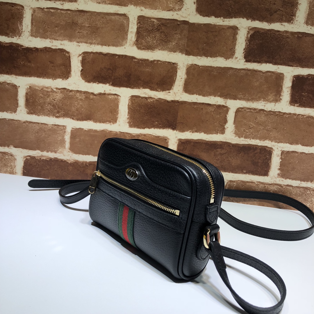 The Gucci Ophidia mini bag is a stylish and practical accessory made of black metal-free tanned leather, with green and red woven detail, gold-toned hardware, and an enamel detail with the Double G logo. The bag has a microfiber lining with a suede-like finish, an attached key ring, a front zipper pocket, an interior open pocket, an adjustable shoulder strap with a 65cm drop, and zipper closure. It can fit a cell phone up to W78mm x H158mm x D8mm, and the Gucci card case wallet will fit inside. It measures W17.5cm x H12cm x D5.5cm and has a weight of approximately0 .3kg.